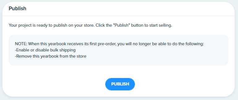 Once your yearbook project is complete or in progress, you can publish it in your online store for customers to purchase. Follow the steps below to publish your book using either Pre-Order or Published Ordering options.